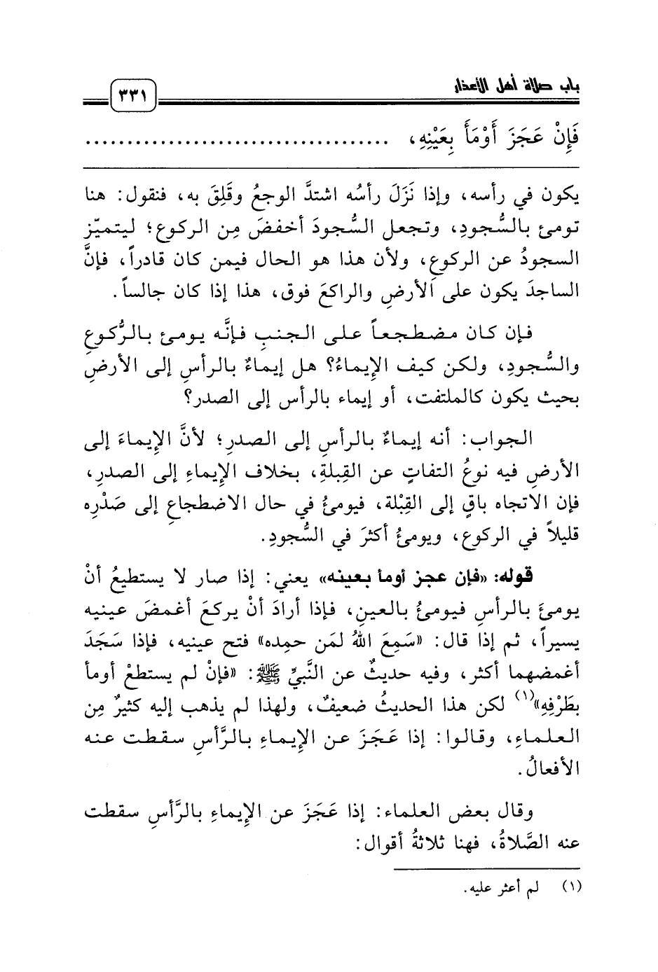 قوله: «فإن عجز أومأ بعينه» يعني: إذا صار لا يستطيعُ أنْ يومئَ بالرأسِ فيومئُ بالعينِ، فإذا أرادَ أنْ يركعَ أغمضَ عينيه يسيراً، ثم إذا قال: «سَمِعَ اللهُ لمَن حمِده» فتح عينيه، فإذا سَجَدَ أغمضهما أكثر، وفيه حديثٌ عن النَّبيِّ صلّى الله عليه وسلّم: «فإنْ لم يستطعْ أومأ بطَرْفِهِ» (¬1) لكن هذا الحديثُ ضعيفٌ، ولهذا لم يذهب إليه كثيرٌ مِن العلماءِ، وقالوا: إذا عَجَزَ عن الإِيماءِ بالرَّأسِ سقطت عنه الأفعالُ.
