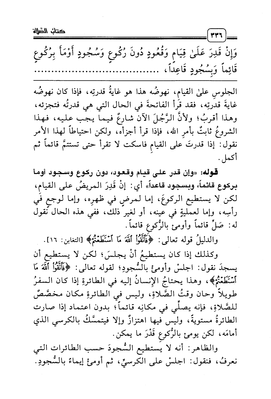 وكذلك إذا كان يستطيعُ أنْ يجلسَ؛ لكن لا يستطيع أن يسجدَ نقول: اجلسْ وأومئْ بالسُّجودِ؛ لقوله تعالى: {فَاتَّقُوا اللَّهَ مَا اسْتَطَعْتُمْ}، وهذا يحتاجُ الإِنسانُ إليه في الطائرةِ إذا كان السفرُ طويلاً وحان وقتُ الصَّلاةِ، وليس في الطائرةِ مكان مخصَّصٌ للصَّلاةِ، فإنه يصلِّي في مكانِه قائماً؛ بدون اعتماد إذا صارت الطائرةُ مستويةً، وليس فيها اهتزازٌ وإلا فيتمسَّكُ بالكرسي الذي أمامَه، لكن يومئ بالرُّكوعِ قَدْرَ ما يمكن.