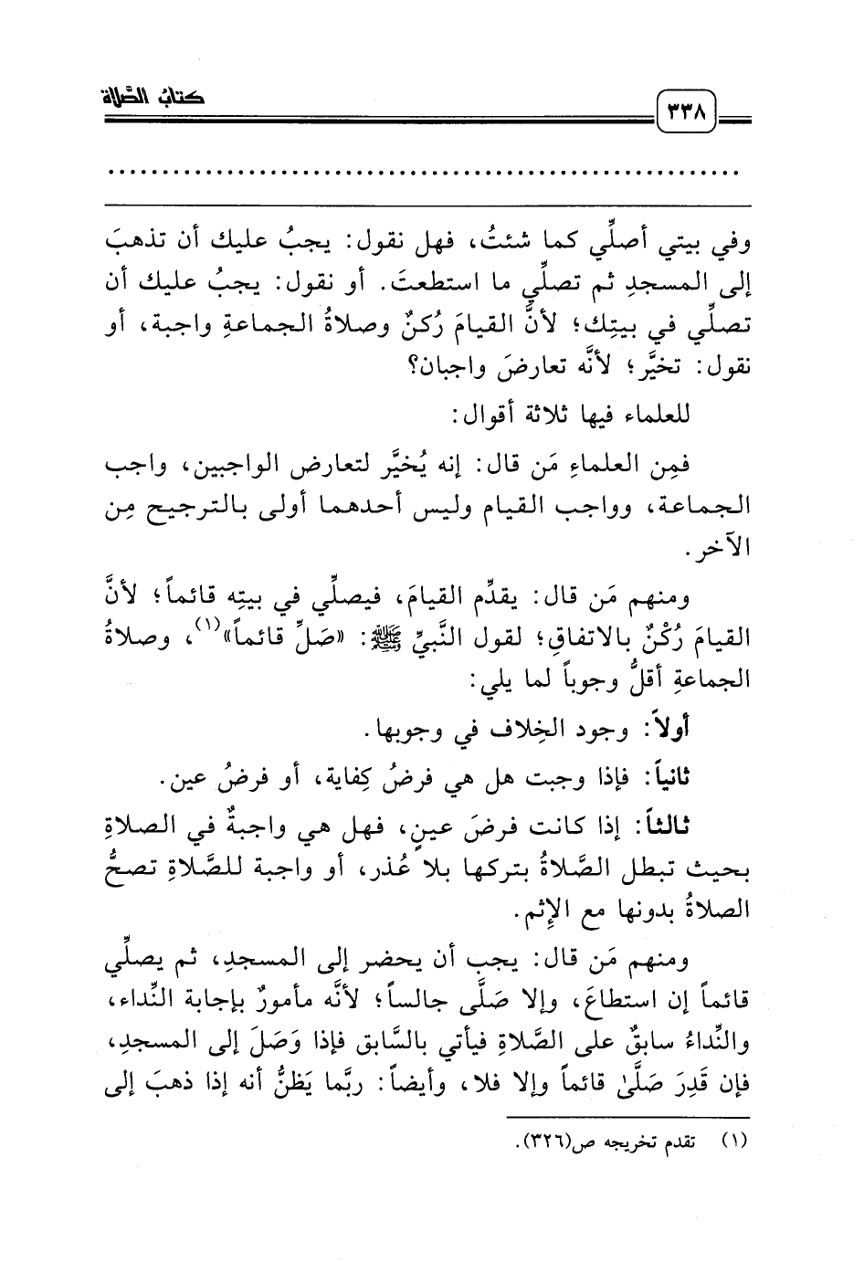 وفي بيتي أصلِّي كما شئتُ، فهل نقول: يجبُ عليك أن تذهبَ إلى المسجدِ ثم تصلِّي ما استطعتَ. أو نقول: يجبُ عليك أن تصلِّي في بيتِك؛ لأنَّ القيامَ رُكنٌ وصلاةُ الجماعةِ واجبة، أو نقول: تخيَّر؛ لأنَّه تعارضَ واجبان؟