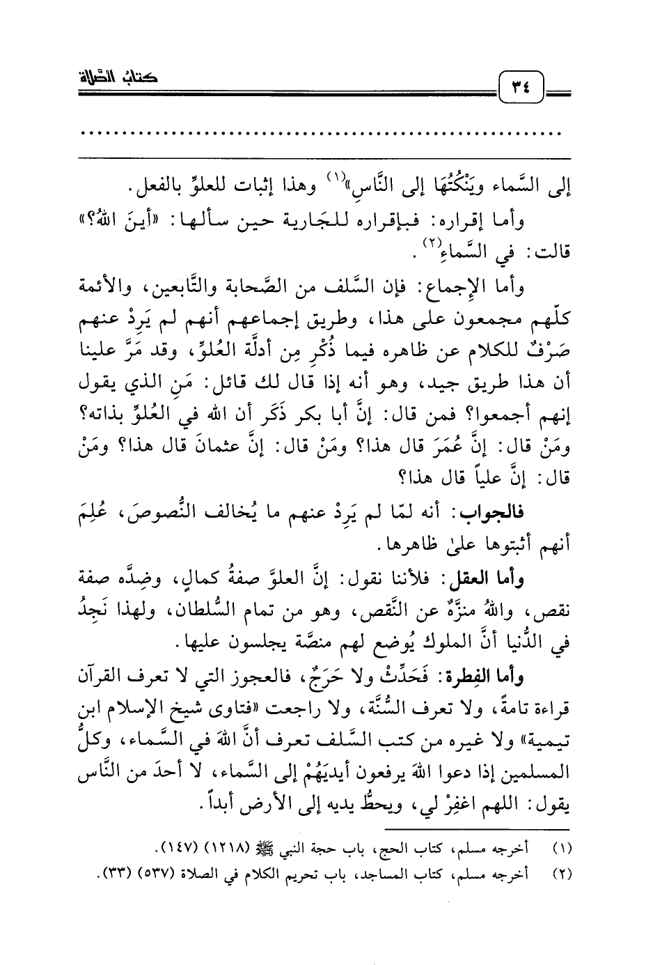 وأما الفِطرة: فَحَدِّثْ ولا حَرَجٌ، فالعجوز التي لا تعرف القرآن قراءة تامةً، ولا تعرف السُّنَّة، ولا راجعت «فتاوى شيخ الإسلام ابن تيمية» ولا غيره من كتب السَّلف تعرف أنَّ اللهَ في السَّماء، وكلُّ المسلمين إذا دعوا اللهَ يرفعون أيديَهُمْ إلى السَّماء، لا أحدَ من النَّاس يقول: اللهم اغفِرْ لي، ويحطُّ يديه إلى الأرض أبداً.