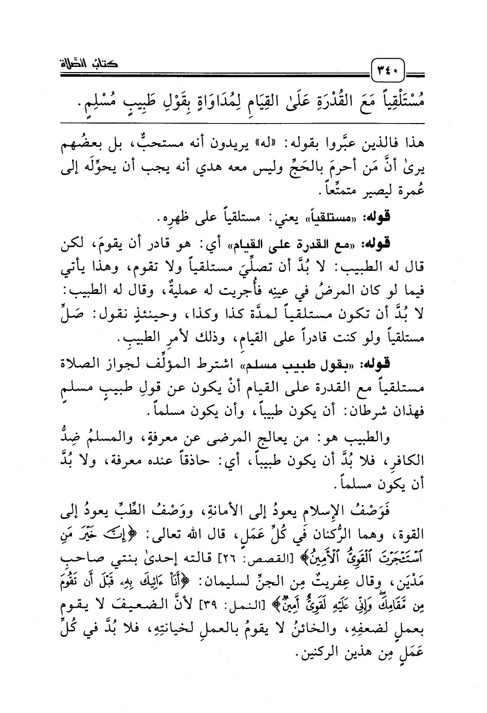 فَوَصْفُ الإِسلامِ يعودُ إلى الأمانةِ، ووَصْفُ الطِّبِّ يعودُ إلى القوة، وهما الرُّكنان في كُلِّ عَمَلٍ، قال الله تعالى: {إِنَّ خَيْرَ مَنِ اسْتَأْجَرْتَ الْقَوِيُّ الأَمِينُ} [القصص: 26] قالته إحدى بنتي صاحبِ مَدْيَن، وقال عِفريتٌ مِن الجنِّ لسليمان: {أَنَا آتِيكَ بِهِ قَبْلَ أَنْ تَقُومَ مِنْ مَقَامِكَ وَإِنِّي عَلَيْهِ لَقَوِيٌّ أَمِينٌ} [النمل: 39] لأنَّ الضعيفَ لا يقوم بعملٍ لضعفِهِ، والخائنُ لا يقومُ بالعملِ لخيانتِهِ، فلا بُدَّ في كُلِّ عَمَلٍ مِن هذين الركنين.