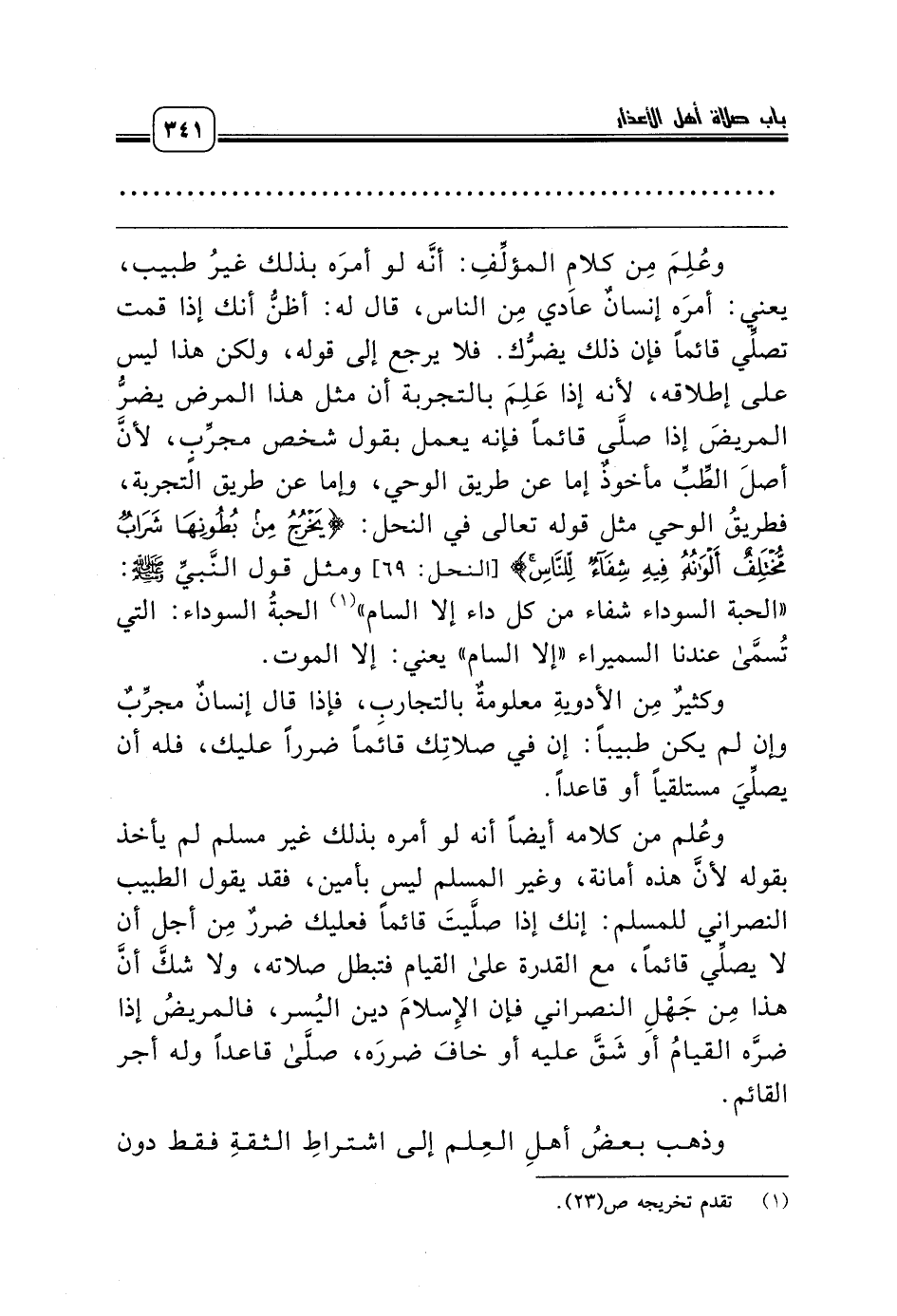 وعُلِمَ مِن كلامِ المؤلِّفِ: أنَّه لو أمرَه بذلك غيرُ طبيب، يعني: أمرَه إنسانٌ عادي مِن الناس، قال له: أظنُّ أنك إذا قمت تصلِّي قائماً فإن ذلك يضرُّك. فلا يرجع إلى قوله، ولكن هذا ليس على إطلاقه، لأنه إذا عَلِمَ بالتجربة أن مثل هذا المرض يضرُّ المريضَ إذا صلَّى قائماً فإنه يعمل بقول شخص مجرِّبٍ، لأنَّ أصلَ الطِّبِّ مأخوذٌ إما عن طريق الوحي، وإما عن طريق التجربة، فطريقُ الوحي مثل قوله تعالى في النحل: {يَخْرُجُ مِنْ بُطُونِهَا شَرَابٌ مُخْتَلِفٌ أَلْوَانُهُ فِيهِ شِفَاءٌ لِلنَّاسِ} [النحل: 69] ومثل قول النَّبيِّ صلّى الله عليه وسلّم: «الحبة السوداء شفاء من كل داء إلا السام» (¬1) الحبةُ السوداء: التي تُسمَّى عندنا السميراء «إلا السام» يعني: إلا الموت.