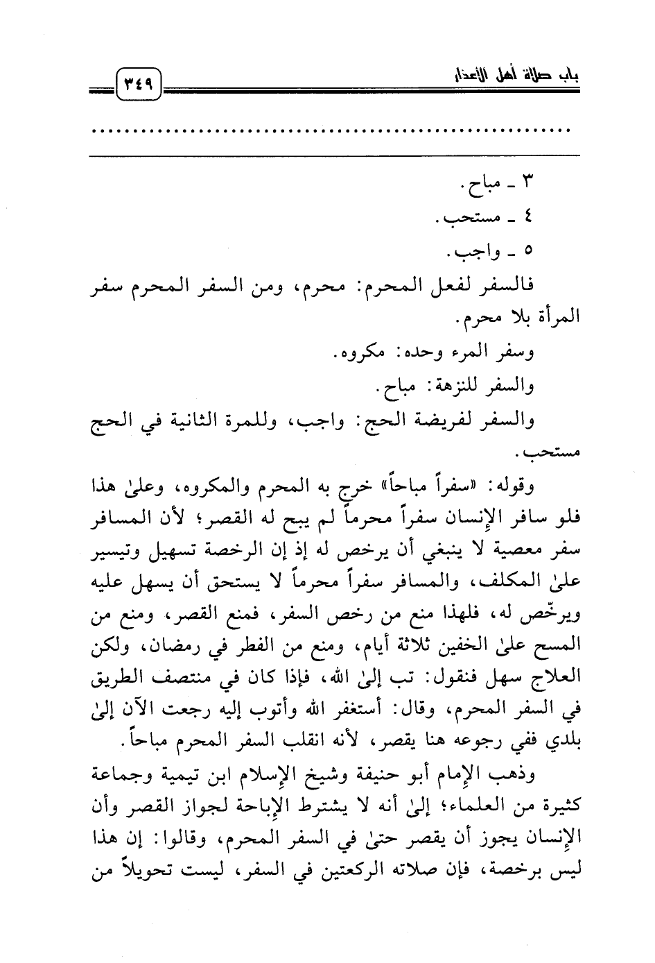 وذهب الإِمام أبو حنيفة وشيخ الإِسلام ابن تيمية وجماعة كثيرة من العلماء؛ إلى أنه لا يشترط الإِباحة لجواز القصر وأن الإِنسان يجوز أن يقصر حتى في السفر المحرم، وقالوا: إن هذا ليس برخصة، فإن صلاته الركعتين في السفر، ليست تحويلاً من