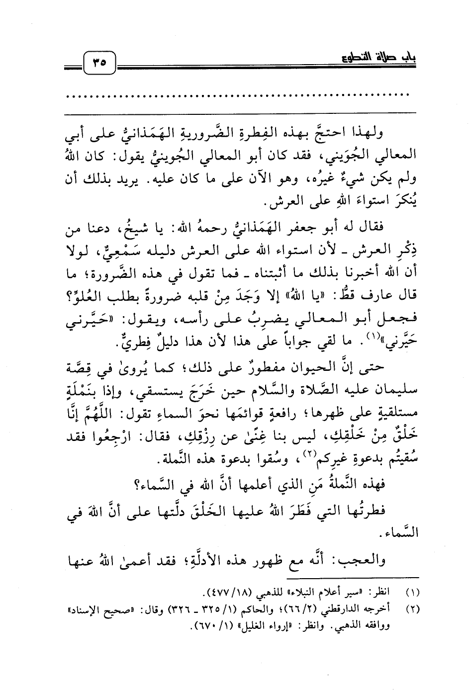 فقال له أبو جعفر الهَمَذانيُّ رحمه الله: يا شيخُ، دعنا من ذِكْرِ العرش ـ لأن استواء الله على العرش دليله سَمْعِيٌّ، لولا أن الله أخبرنا بذلك ما أثبتناه ـ فما تقول في هذه الضَّرورة؛ ما قال عارف قطُّ: «يا اللهُ» إلا وَجَدَ مِنْ قلبه ضرورةً بطلب العُلوِّ؟ فجعل أبو المعالي يضرِبُ على رأسه، ويقول: «حَيَّرني حَيَّرني» (¬1). ما لقي جواباً على هذا لأن هذا دليلٌ فِطريٌّ.