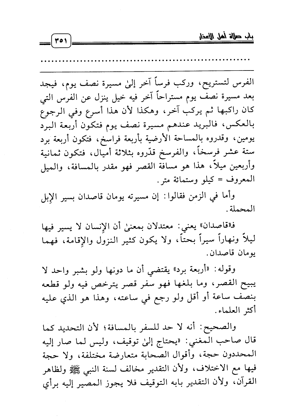 الفرس لتستريح، وركب فرساً آخر إلى مسيرة نصف يوم، فيجد بعد مسيرة نصف يوم مستراحاً آخر فيه خيل ينزل عن الفرس التي كان راكبها ثم يركب آخر، وهكذا لأن هذا أسرع وفي الرجوع بالعكس، فالبريد عندهم مسيرة نصف يوم فتكون أربعة البرد يومين، وقدروه بالمساحة الأرضية بأربعة فراسخ، فتكون أربعة برد ستة عشر فرسخاً، والفرسخ قدّروه بثلاثة أميال، فتكون ثمانية وأربعين ميلاً، هذا هو مسافة القصر فهو مقدر بالمسافة، والميل المعروف = كيلو وستمائة متر.