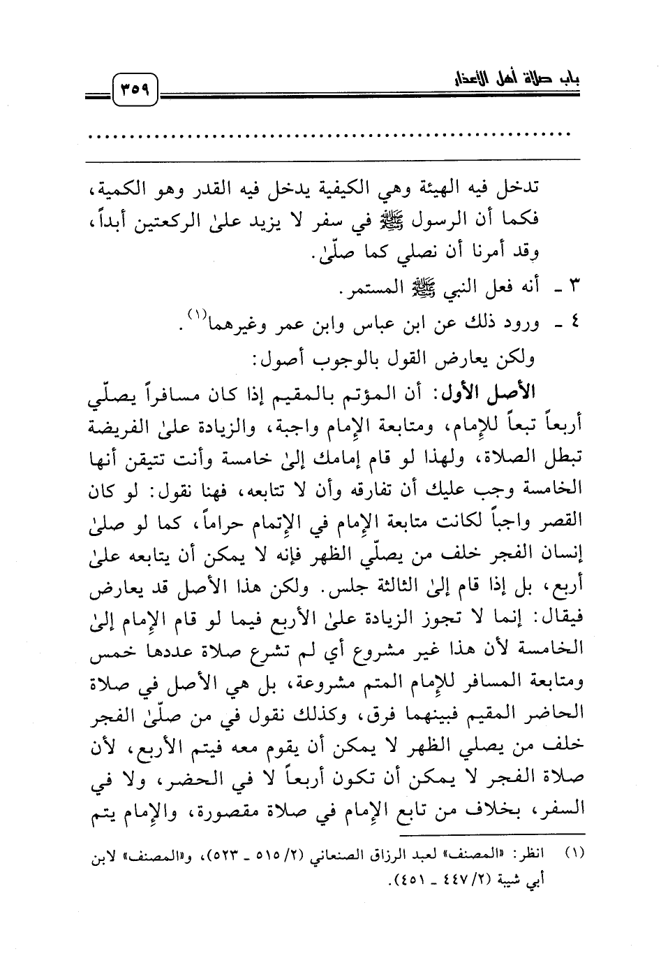 الأصل الأول: أن المؤتم بالمقيم إذا كان مسافراً يصلّي أربعاً تبعاً للإِمام، ومتابعة الإِمام واجبة، والزيادة على الفريضة تبطل الصلاة، ولهذا لو قام إمامك إلى خامسة وأنت تتيقن أنها الخامسة وجب عليك أن تفارقه وأن لا تتابعه، فهنا نقول: لو كان القصر واجباً لكانت متابعة الإِمام في الإِتمام حراماً، كما لو صلى إنسان الفجر خلف من يصلّي الظهر فإنه لا يمكن أن يتابعه على أربع، بل إذا قام إلى الثالثة جلس. ولكن هذا الأصل قد يعارض فيقال: إنما لا تجوز الزيادة على الأربع فيما لو قام الإِمام إلى الخامسة لأن هذا غير مشروع أي لم تشرع صلاة عددها خمس ومتابعة المسافر للإِمام المتم مشروعة، بل هي الأصل في صلاة الحاضر المقيم فبينهما فرق، وكذلك نقول في من صلّى الفجر خلف من يصلي الظهر لا يمكن أن يقوم معه فيتم الأربع، لأن صلاة الفجر لا يمكن أن تكون أربعاً لا في الحضر، ولا في السفر، بخلاف من تابع الإِمام في صلاة مقصورة، والإِمام يتم
