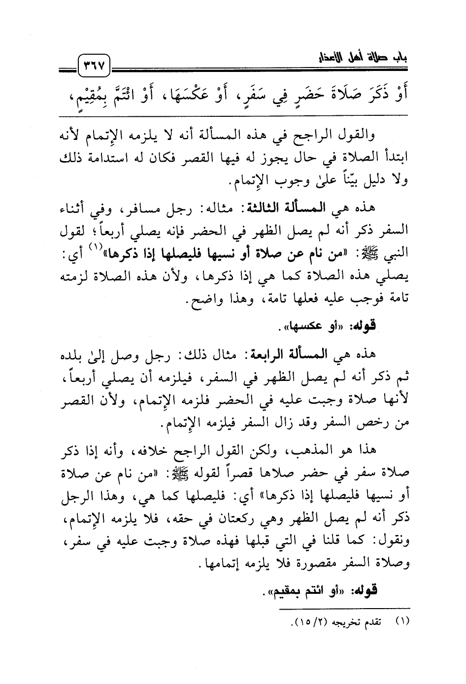 هذه هي المسألة الثالثة: مثاله: رجل مسافر، وفي أثناء السفر ذكر أنه لم يصل الظهر في الحضر فإنه يصلي أربعاً؛ لقول النبي صلّى الله عليه وسلّم: «من نام عن صلاة أو نسيها فليصلها إذا ذكرها» (¬1) أي: يصلي هذه الصلاة كما هي إذا ذكرها، ولأن هذه الصلاة لزمته تامة فوجب عليه فعلها تامة، وهذا واضح.