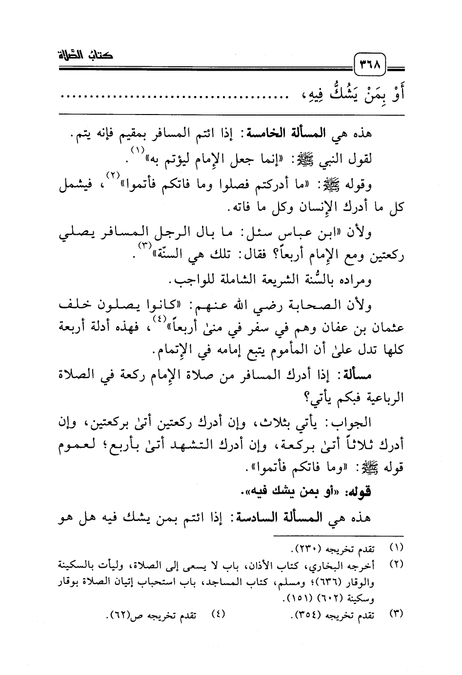 هذه هي المسألة الخامسة: إذا ائتم المسافر بمقيم فإنه يتم.