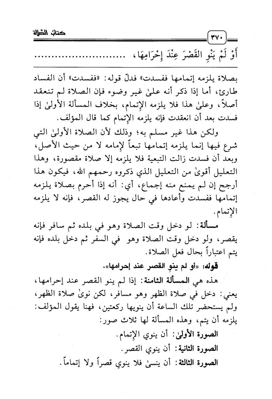 هذه هي المسألة الثامنة: إذا لم ينو القصر عند إحرامها، يعني: دخل في صلاة الظهر وهو مسافر، لكن نوى صلاة الظهر، ولم يستحضر تلك الساعة أن ينويها ركعتين، فهنا يقول المؤلف: يلزمه أن يتم، وهذه المسألة لها ثلاث صور: