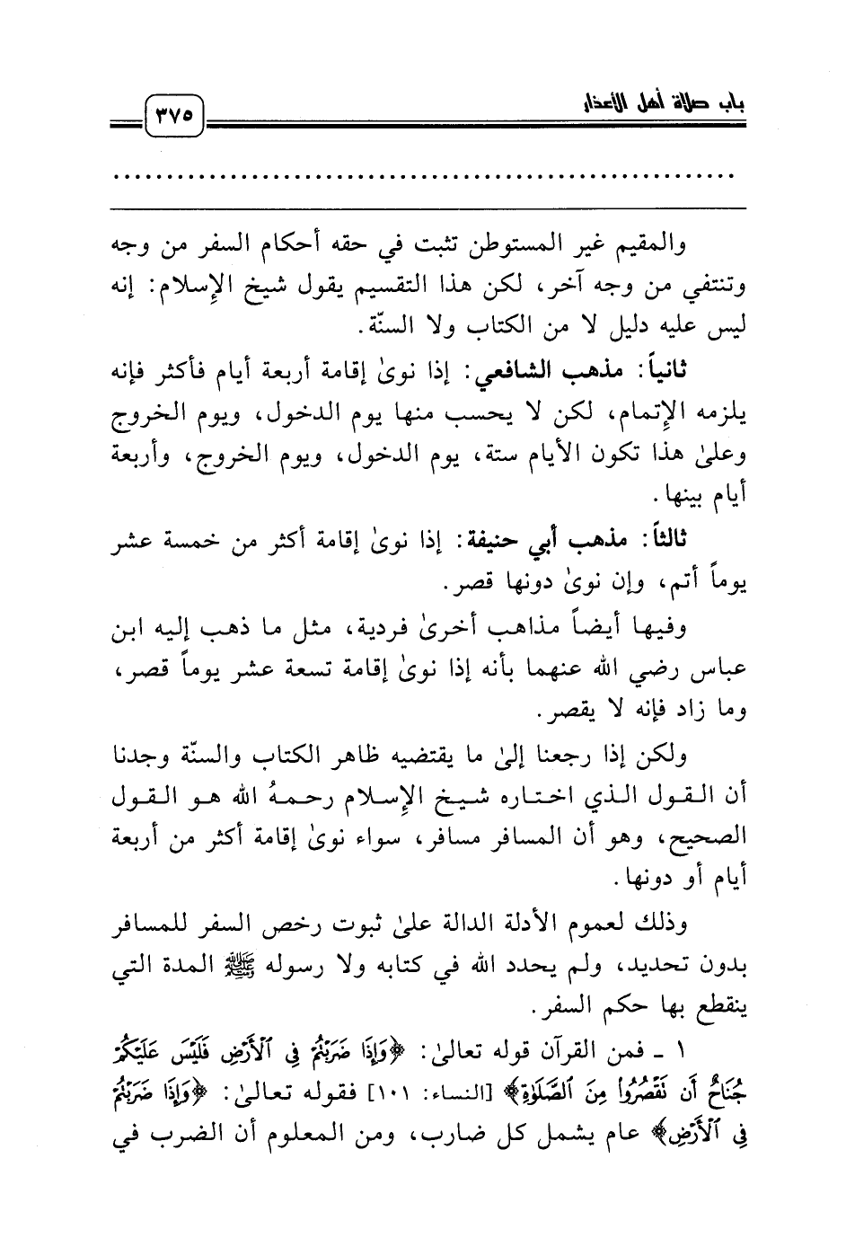 ولكن إذا رجعنا إلى ما يقتضيه ظاهر الكتاب والسنّة وجدنا أن القول الذي اختاره شيخ الإِسلام رحمه الله هو القول الصحيح، وهو أن المسافر مسافر، سواء نوى إقامة أكثر من أربعة أيام أو دونها.