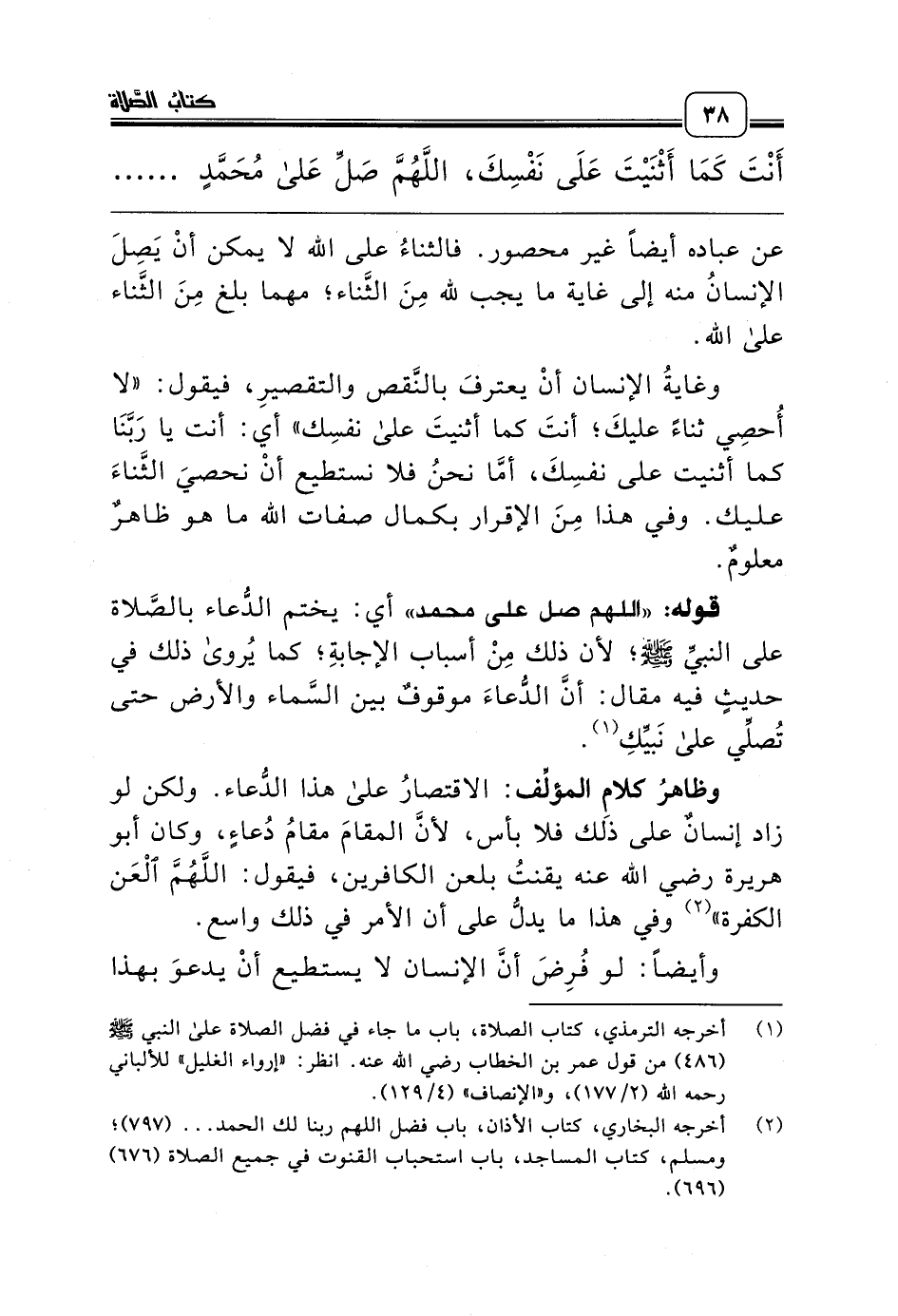 وغايةُ الإنسان أنْ يعترفَ بالنَّقص والتقصيرِ، فيقول: «لا أُحصِي ثناءً عليكَ؛ أنتَ كما أثنيتَ على نفسِك» أي: أنت يا رَبَّنَا كما أثنيت على نفسِكَ، أمَّا نحنُ فلا نستطيع أنْ نحصيَ الثَّناءَ عليك. وفي هذا مِنَ الإقرار بكمال صفات الله ما هو ظاهرٌ معلومٌ.