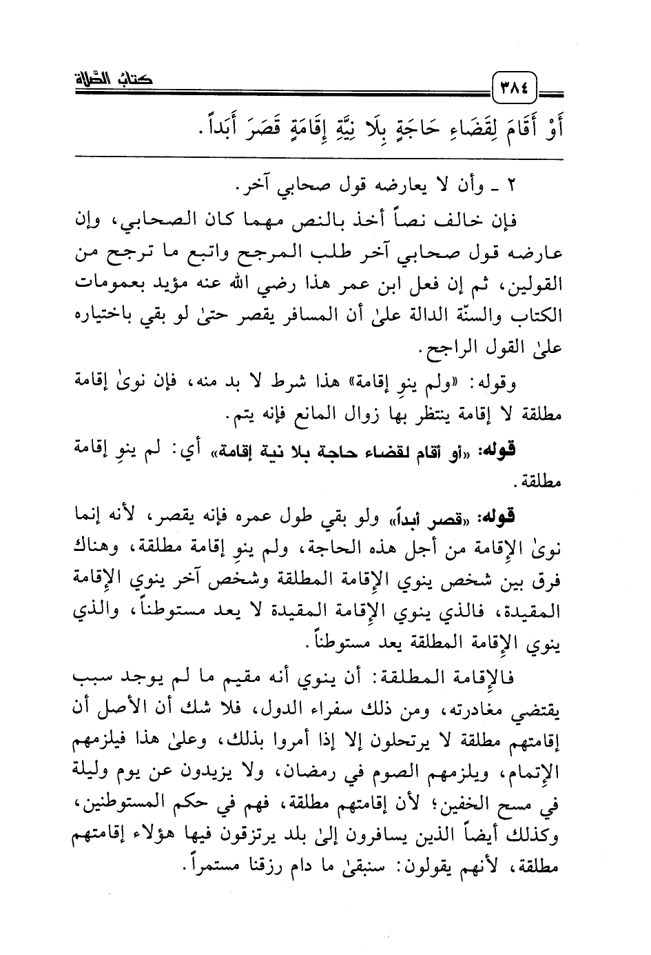 قوله: «قصر أبداً» ولو بقي طول عمره فإنه يقصر، لأنه إنما نوى الإِقامة من أجل هذه الحاجة، ولم ينوِ إقامة مطلقة، وهناك فرق بين شخص ينوي الإِقامة المطلقة وشخص آخر ينوي الإِقامة المقيدة، فالذي ينوي الإِقامة المقيدة لا يعد مستوطناً، والذي ينوي الإِقامة المطلقة يعد مستوطناً.