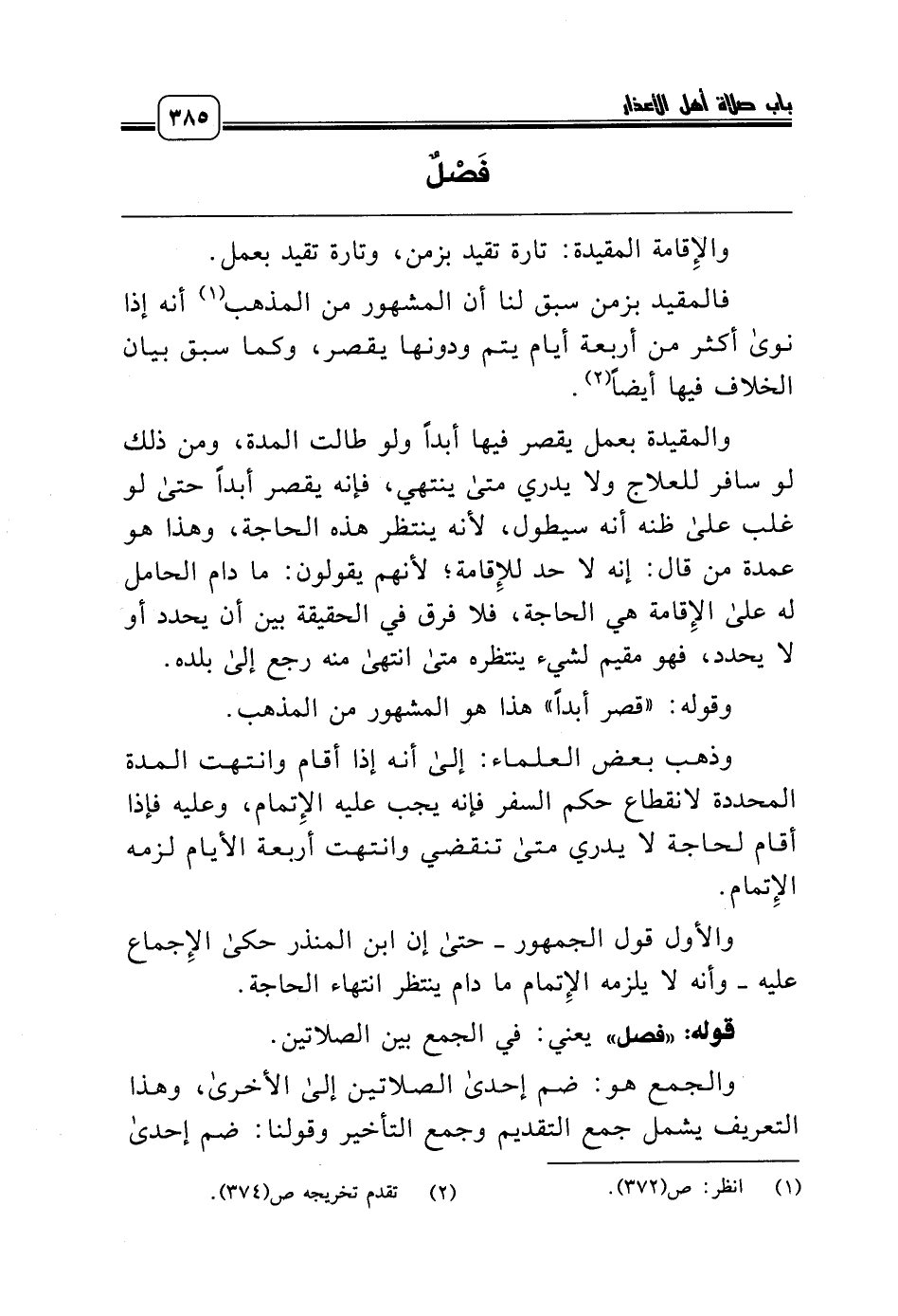 والمقيدة بعمل يقصر فيها أبداً ولو طالت المدة، ومن ذلك لو سافر للعلاج ولا يدري متى ينتهي، فإنه يقصر أبداً حتى لو غلب على ظنه أنه سيطول، لأنه ينتظر هذه الحاجة، وهذا هو عمدة من قال: إنه لا حد للإِقامة؛ لأنهم يقولون: ما دام الحامل له على الإِقامة هي الحاجة، فلا فرق في الحقيقة بين أن يحدد أو لا يحدد، فهو مقيم لشيء ينتظره متى انتهى منه رجع إلى بلده.