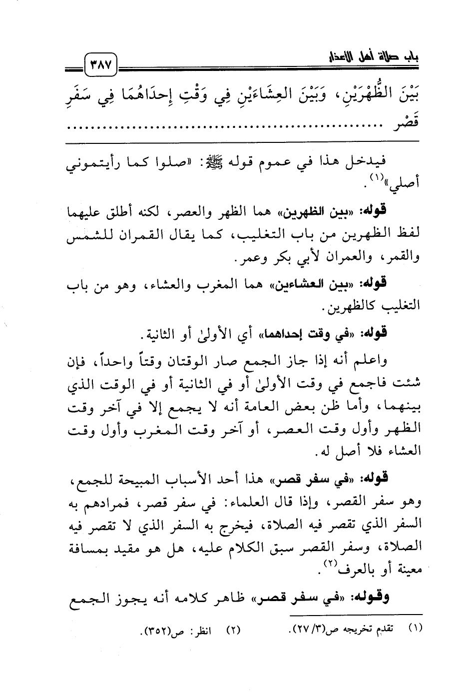 قوله: «في سفر قصر» هذا أحد الأسباب المبيحة للجمع، وهو سفر القصر، وإذا قال العلماء: في سفر قصر، فمرادهم به السفر الذي تقصر فيه الصلاة، فيخرج به السفر الذي لا تقصر فيه الصلاة، وسفر القصر سبق الكلام عليه، هل هو مقيد بمسافة معينة أو بالعرف (¬2).