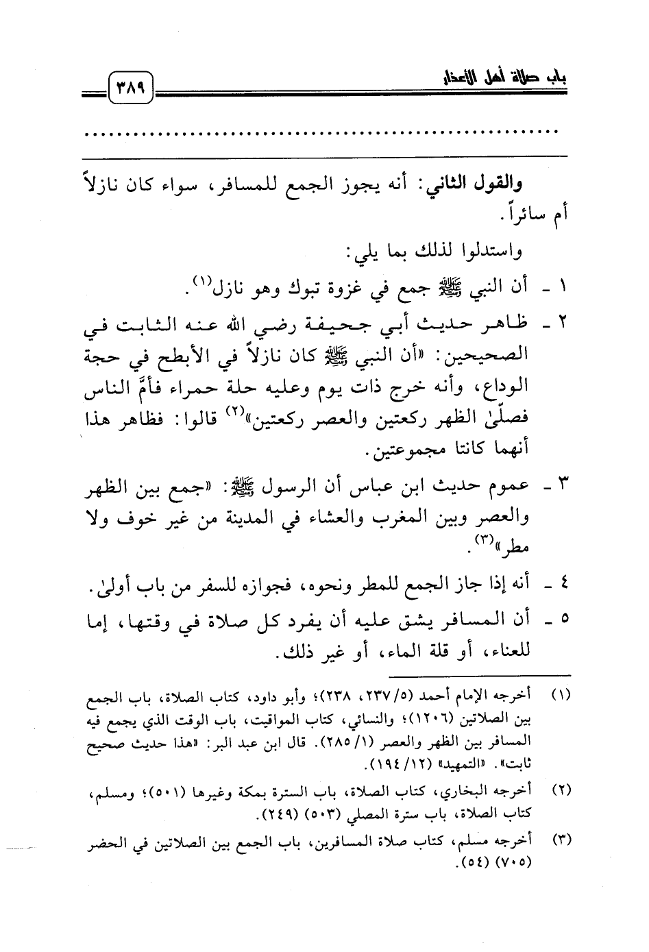 3 ـ عموم حديث ابن عباس أن الرسول صلّى الله عليه وسلّم: «جمع بين الظهر والعصر وبين المغرب والعشاء في المدينة من غير خوف ولا مطر» (¬3).