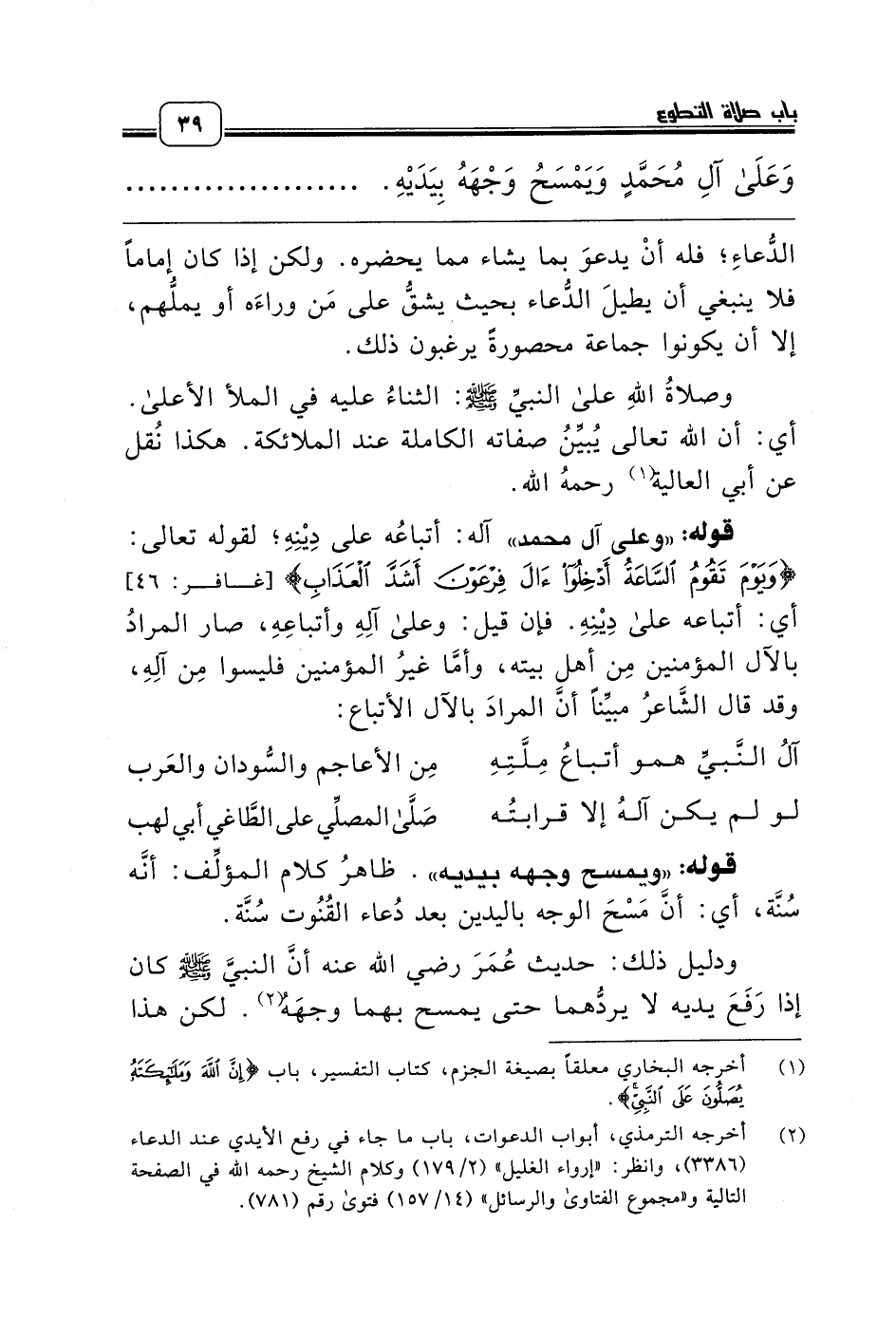 قوله: «وعلى آل محمد» آله: أتباعُه على دِيْنِهِ؛ لقوله تعالى: {وَيَوْمَ تَقُومُ السَّاعَةُ أَدْخِلُوا آلَ فِرْعَوْنَ أَشَدَّ الْعَذَابِ} [غافر: 46] أي: أتباعه على دِيْنِهِ. فإن قيل: وعلى آلِهِ وأتباعِهِ، صار المرادُ بالآل المؤمنين مِن أهل بيته، وأمَّا غيرُ المؤمنين فليسوا مِن آلِهِ، وقد قال الشَّاعرُ مبيِّناً أنَّ المرادَ بالآل الأتباع: