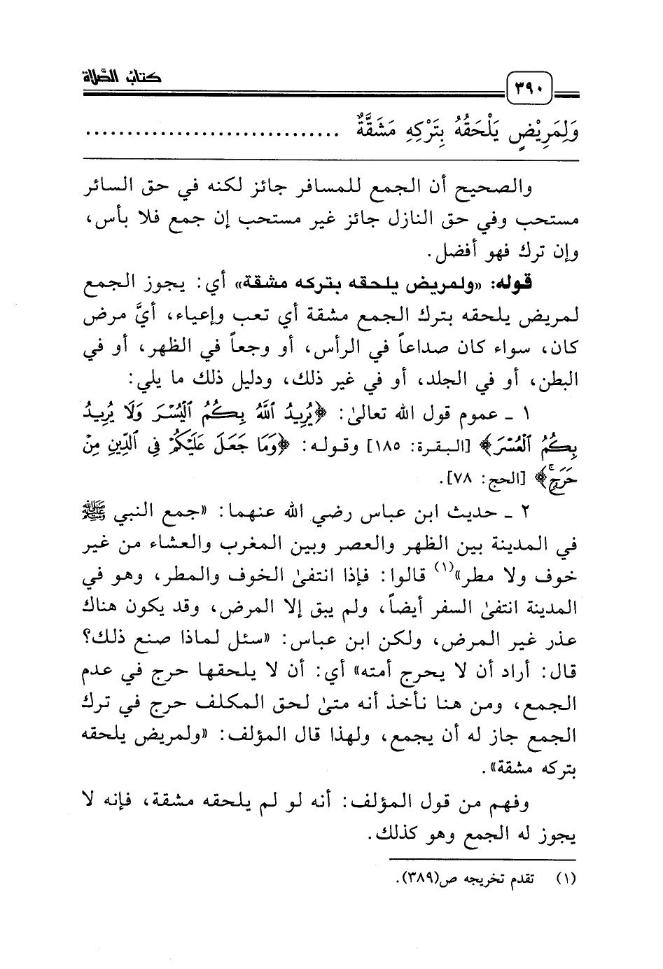 2 ـ حديث ابن عباس رضي الله عنهما: «جمع النبي صلّى الله عليه وسلّم في المدينة بين الظهر والعصر وبين المغرب والعشاء من غير خوف ولا مطر» (¬1) قالوا: فإذا انتفى الخوف والمطر، وهو في المدينة انتفى السفر أيضاً، ولم يبق إلا المرض، وقد يكون هناك عذر غير المرض، ولكن ابن عباس: «سئل لماذا صنع ذلك؟ قال: أراد أن لا يحرج أمته» أي: أن لا يلحقها حرج في عدم الجمع، ومن هنا نأخذ أنه متى لحق المكلف حرج في ترك الجمع جاز له أن يجمع، ولهذا قال المؤلف: «ولمريض يلحقه بتركه مشقة».