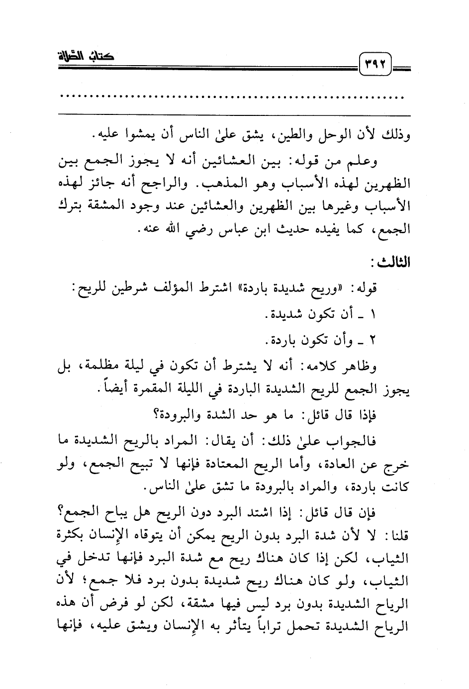 فإن قال قائل: إذا اشتد البرد دون الريح هل يباح الجمع؟ قلنا: لا لأن شدة البرد بدون الريح يمكن أن يتوقاه الإِنسان بكثرة الثياب، لكن إذا كان هناك ريح مع شدة البرد فإنها تدخل في الثياب، ولو كان هناك ريح شديدة بدون برد فلا جمع؛ لأن الرياح الشديدة بدون برد ليس فيها مشقة، لكن لو فرض أن هذه الرياح الشديدة تحمل تراباً يتأثر به الإِنسان ويشق عليه، فإنها