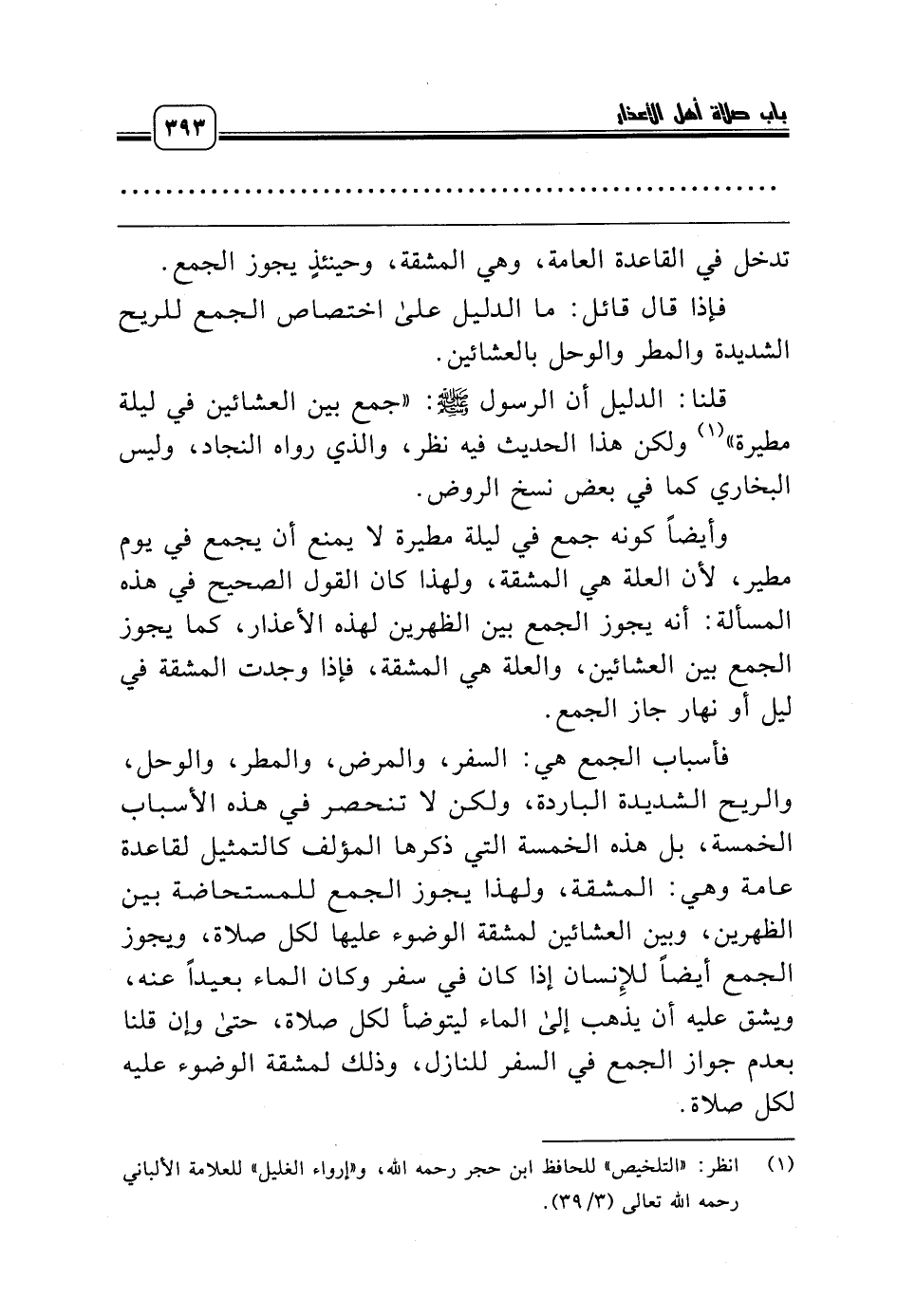 فأسباب الجمع هي: السفر، والمرض، والمطر، والوحل، والريح الشديدة الباردة، ولكن لا تنحصر في هذه الأسباب الخمسة، بل هذه الخمسة التي ذكرها المؤلف كالتمثيل لقاعدة عامة وهي: المشقة، ولهذا يجوز الجمع للمستحاضة بين الظهرين، وبين العشائين لمشقة الوضوء عليها لكل صلاة، ويجوز الجمع أيضاً للإِنسان إذا كان في سفر وكان الماء بعيداً عنه، ويشق عليه أن يذهب إلى الماء ليتوضأ لكل صلاة، حتى وإن قلنا بعدم جواز الجمع في السفر للنازل، وذلك لمشقة الوضوء عليه لكل صلاة.