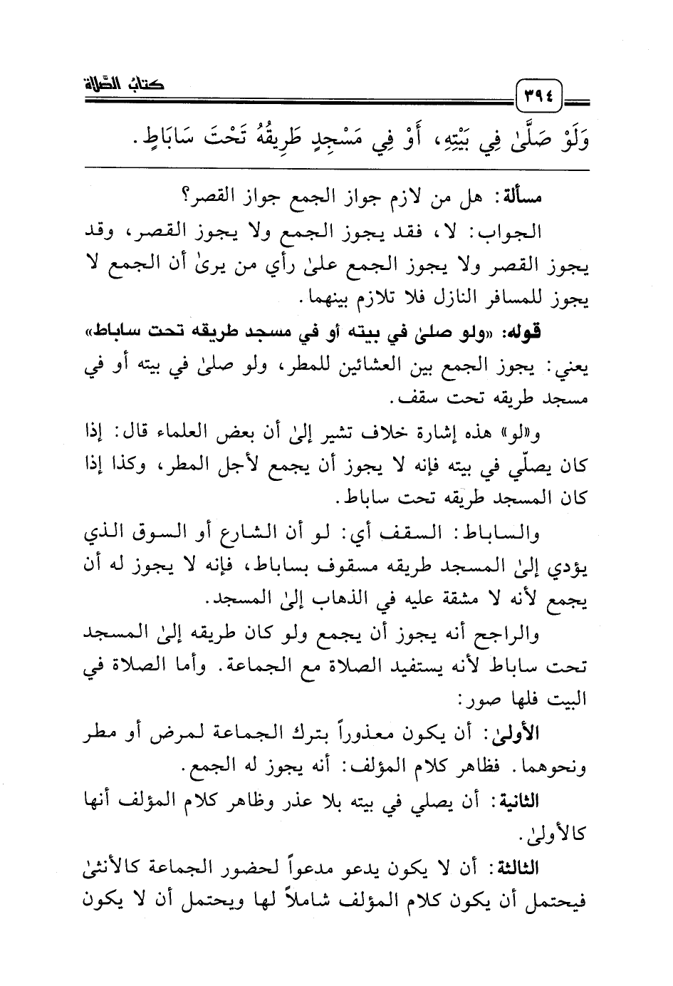 قوله: «ولو صلى في بيته أو في مسجد طريقه تحت ساباط» يعني: يجوز الجمع بين العشائين للمطر، ولو صلى في بيته أو في مسجد طريقه تحت سقف.