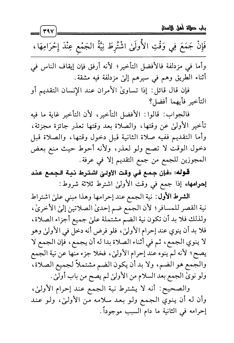 قوله: «فإن جمع في وقت الأولى اشترط نية الجمع عند إحرامها» إذا جمع في وقت الأولى اشترط ثلاثة شروط: