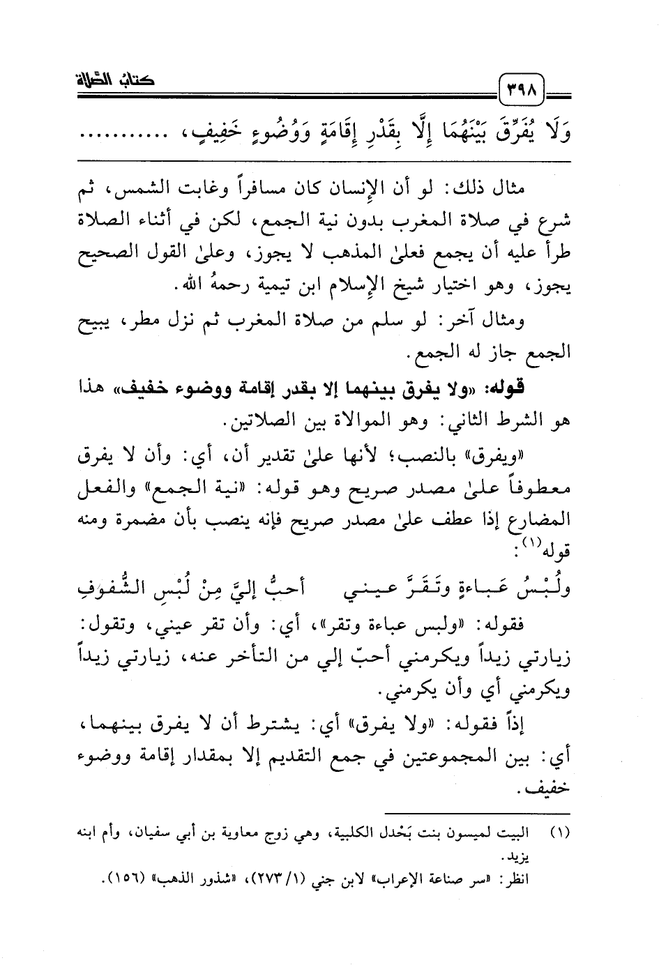 «ويفرق» بالنصب؛ لأنها على تقدير أن، أي: وأن لا يفرق معطوفاً على مصدر صريح وهو قوله: «نية الجمع» والفعل المضارع إذا عطف على مصدر صريح فإنه ينصب بأن مضمرة ومنه قوله (¬1):