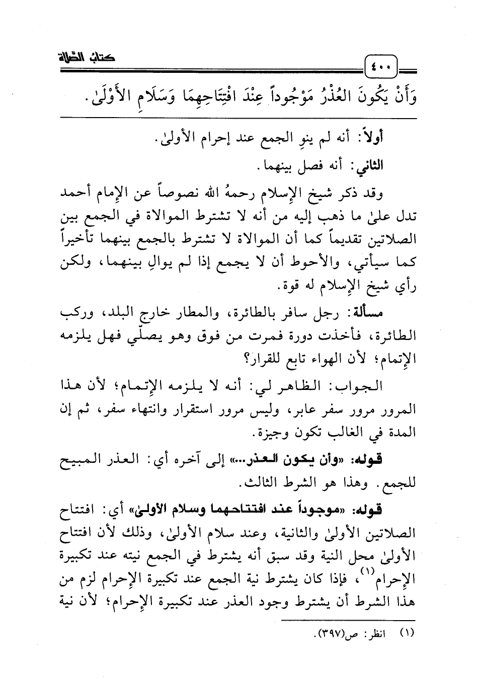 وَأَنْ يَكُونَ العُذْرُ مَوْجُوداً عِنْدَ افْتِتَاحِهِمَا وَسَلاَمِ الأَوْلَى ..........
