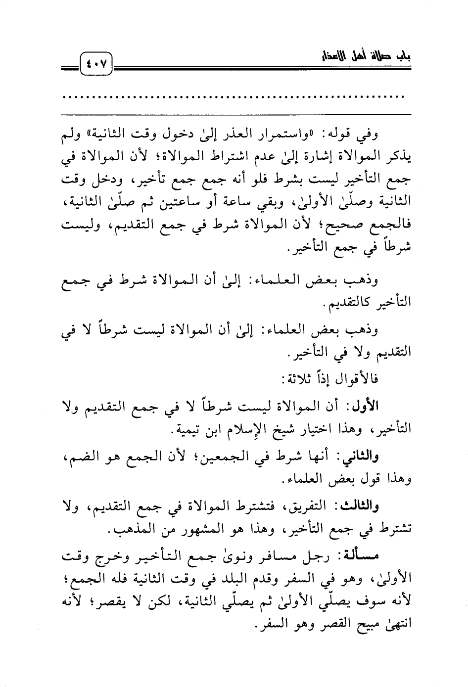 الأول: أن الموالاة ليست شرطاً لا في جمع التقديم ولا التأخير، وهذا اختيار شيخ الإِسلام ابن تيمية.