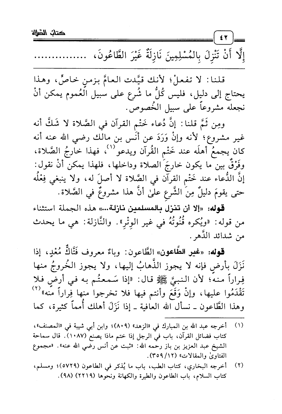 ومِن ثَمَّ قلنا: إنَّ دُعاء خَتْمِ القرآن في الصَّلاة لا شَكَّ أنه غير مشروع؛ لأنه وإنْ وَرَدَ عن أنس بن مالك رضي الله عنه أنه كان يجمعُ أهلَه عند خَتْمِ القُرآن ويدعو (¬1)، فهذا خارجُ الصَّلاة، وفَرْقٌ بين ما يكون خارجَ الصلاة وداخلها، فلهذا يمكن أنْ نقول: إنَّ الدُّعاء عند خَتْمِ القرآن في الصَّلاة لا أصلَ له، ولا ينبغي فِعْلُه حتى يقومَ دليلٌ مِن الشَّرعِ على أنَّ هذا مشروعٌ في الصَّلاة.
