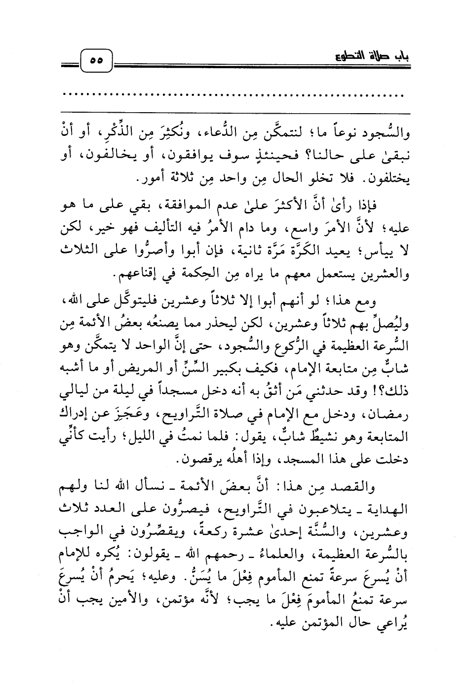 ومع هذا؛ لو أنهم أبوا إلا ثلاثاً وعشرين فليتوكَّل على الله، وليُصلِّ بهم ثلاثاً وعشرين، لكن ليحذر مما يصنعُه بعضُ الأئمة مِن السُّرعة العظيمة في الرُّكوع والسُّجود، حتى إنَّ الواحد لا يتمكَّن وهو شابٌّ مِن متابعة الإمام، فكيف بكبير السِّنِّ أو المريض أو ما أشبه ذلك؟! وقد حدثني مَن أثقُ به أنه دخل مسجداً في ليلة من ليالي رمضان، ودخل مع الإمام في صلاة التَّراويح، وعَجَِزَ عن إدراك المتابعة وهو نشيطٌ شابٌّ، يقول: فلما نمتُ في الليل؛ رأيت كأنِّي دخلت على هذا المسجد، وإذا أهلُه يرقصون.