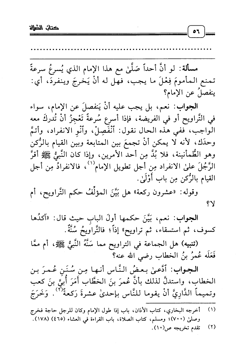 الجواب: نعم، بل يجب عليه أنْ يَنفصلَ عن الإمام، سواء في التَّراويح أو في الفريضة، فإذا أسرع سُرعةً تَعْجِزُ أنْ تُدركَ معه الواجب، ففي هذه الحال نقول: انْفَصِلْ، وانْوِ الانفراد، وأتمَّ وحدَك، لأنه لا يمكن أنْ تجمعَ بين المتابعة وبين القيام بالرُّكن وهو الطُّمأنينة، فلا بُدَّ مِن أحد الأمرين، وإذا كان النَّبيُّ صلّى الله عليه وسلّم أقرَّ الرَّجُلَ على الانفراد مِن أجل تطويل الإمام (¬1)، فالانفرادُ مِن أجل القيام بالرُّكن مِن باب أَوْلَى.