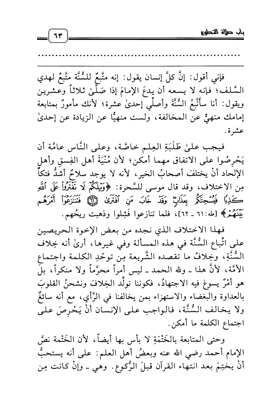 فإني أقول: إنَّ كلَّ إنسان يقول: إنه متَّبعٌ للسُّنَّة متَّبعٌ لهدي السَّلف؛ فإنه لا يسعه أن يدعَ الإمامَ إذا صَلَّى ثلاثاً وعشرين ويقول: أنا سأَتَّبعُ السُّنَّةَ وأصلِّي إحدى عشرة؛ لأنك مأمورٌ بمتابعة إمامك منهيٌّ عن المخالفة، ولست منهيًّا عن الزيادة عن إحدى عشرة.