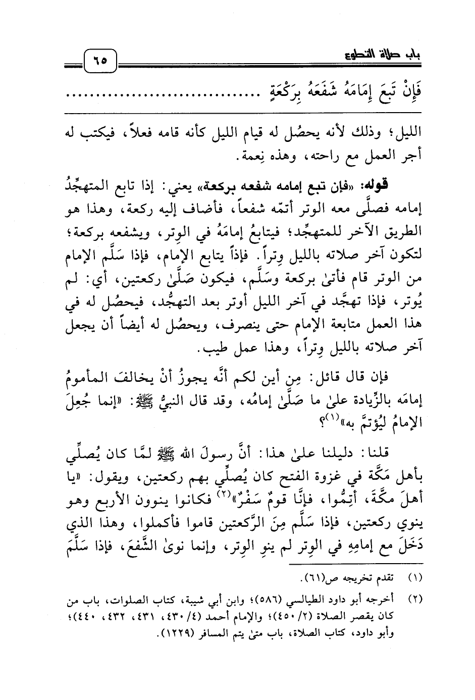 قوله: «فإن تبع إمامه شفعه بركعة» يعني: إذا تابع المتهجِّدُ إمامه فصلَّى معه الوتر أتمّه شفعاً، فأضاف إليه ركعة، وهذا هو الطريق الآخر للمتهجِّد؛ فيتابعُ إمامَهُ في الوِتر، ويشفعه بركعة؛ لتكون آخر صلاته بالليل وِتراً. فإذاً يتابع الإمام، فإذا سَلَّم الإمام من الوتر قام فأتى بركعة وسَلَّم، فيكون صَلَّى ركعتين، أي: لم يُوتر، فإذا تهجَّد في آخر الليل أوتر بعد التهجُّد، فيحصُل له في هذا العمل متابعة الإمام حتى ينصرف، ويحصُل له أيضاً أن يجعل آخر صلاته بالليل وِتراً، وهذا عمل طيب.