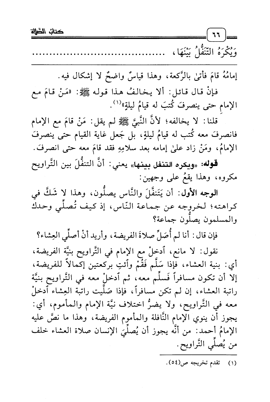 قوله: «ويكره التنفل بينها» يعني: أنَّ التنفُّلَ بين التَّراويح مكروه، وهذا يقعُ على وجهين: