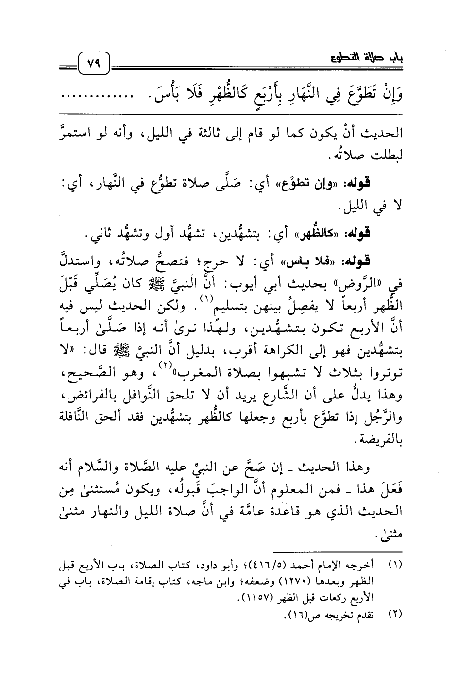 قوله: «فلا بأس» أي: لا حرج؛ فتصحُّ صلاتُه، واستدلَّ في «الرَّوض» بحديث أبي أيوب: أنَّ النبيَّ صلّى الله عليه وسلّم كان يُصَلِّي قَبْلَ الظُّهر أربعاً لا يفصِلُ بينهن بتسليمٍ (¬1). ولكن الحديث ليس فيه أنَّ الأربع تكون بتشهُّدين، ولهذا نرى أنه إذا صَلَّى أربعاً بتشهُّدين فهو إلى الكراهة أقرب، بدليل أنَّ النبيَّ صلّى الله عليه وسلّم قال: «لا توتروا بثلاث لا تشبهوا بصلاة المغرب» (¬2)، وهو الصَّحيح، وهذا يدلُّ على أن الشَّارع يريد أن لا تلحق النَّوافل بالفرائض، والرَّجُل إذا تطوَّع بأربع وجعلها كالظُّهر بتشهُّدين فقد ألحق النَّافلة بالفريضة.