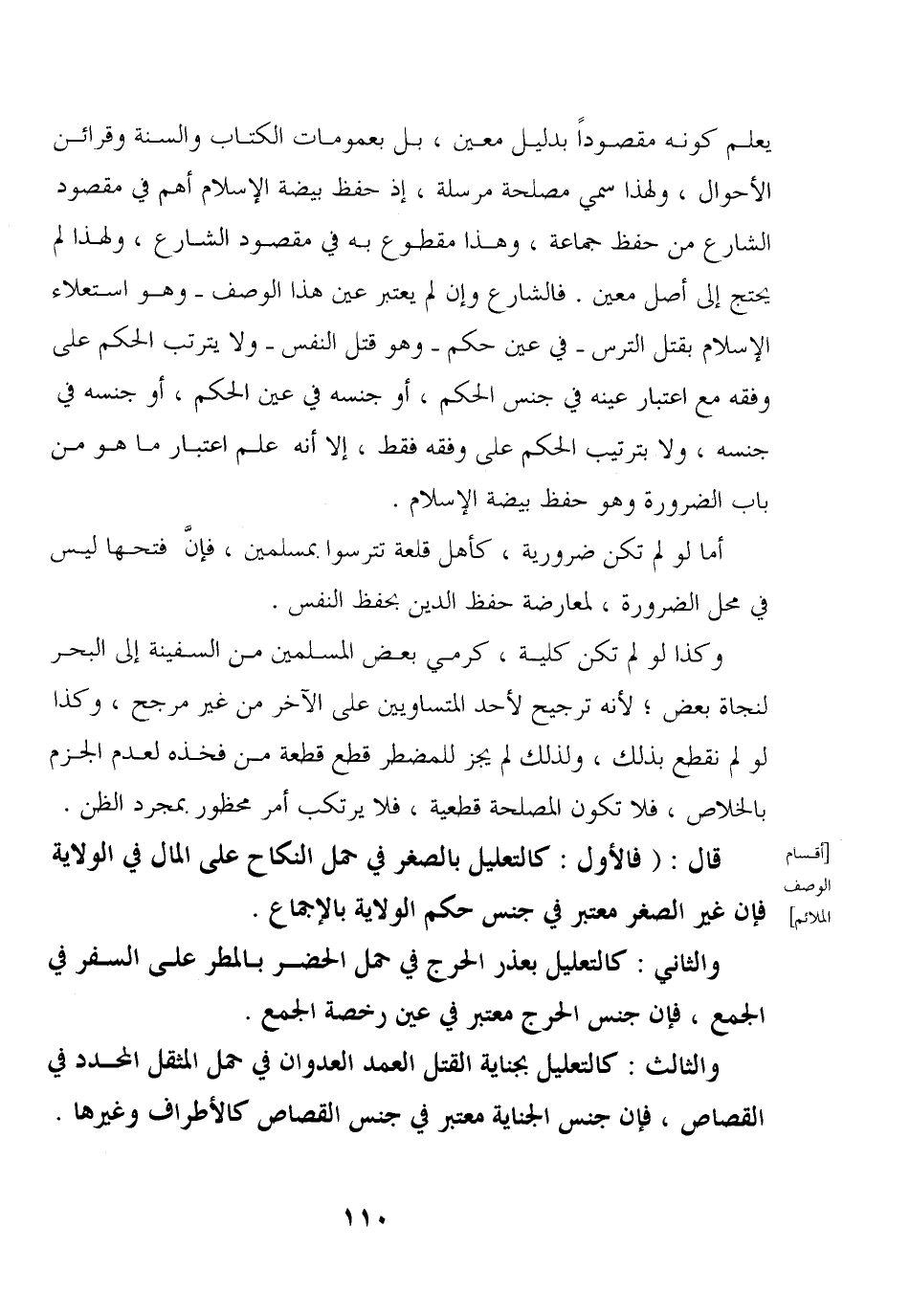 يعلم كونه مقصودا بدليل معين، بل بعمومات الكتاب والسنة وقرائن الأحوال، ولهذا سمي مصلحة مرسلة، إذ حفظ بيضة الإسلام أهم في مقصود الشارع من حفظ جماعة، وهذا مقطوع به في مقصود الشارع، ولهذا لم يحتج إلى أصل معين. فالشارع وإن لم يعتبر عين هذا الوصف –وهو استعلاء الإسلام بقتل الترس- في عين حكم- وهو قتل النفس- ولا يترتب الحكم على وفقه مع اعتبار عينه في جنس الحكم، أو جنسه في عين الحكم، أو جنسه في جنسه، ولا بترتيب الحكم على وفقه فقط، إلا أنه علم اعتبار ما هو من باب الضرورة وهو حفظ بيضة الإسلام.