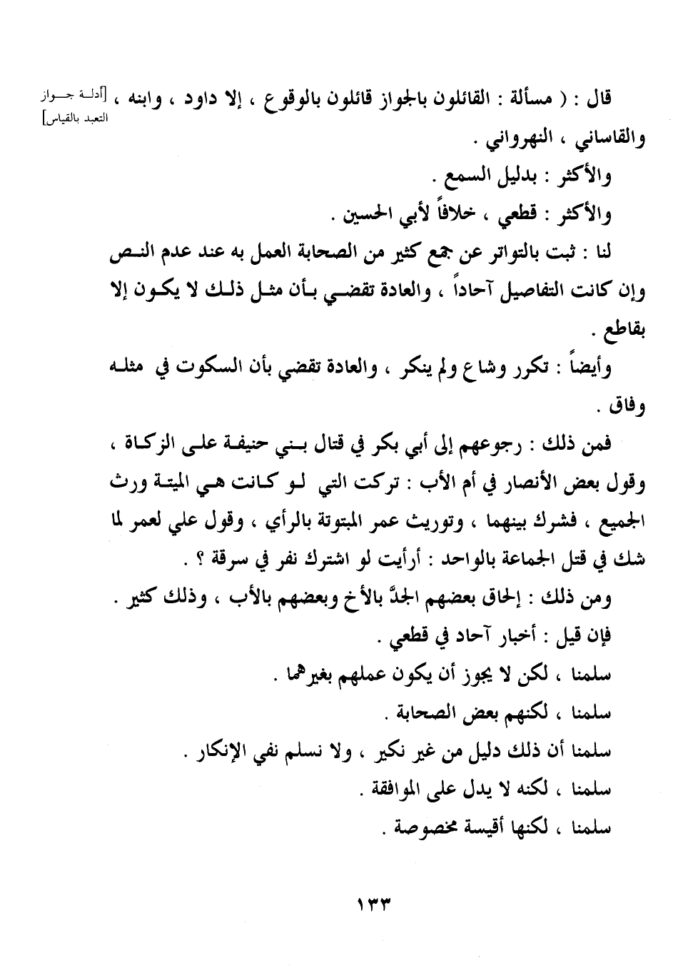 فمن ذلك: رجوعهم إلى أبي بكر في قتال بني حنيفة على الزكاة، وقول بعض الأنصار في أم الأب: تركت التي لو كانت هي الميتة ورث الجميع، فشرك بينهما، وتوريث عمر المبتوتة بالرأي، وقول علي لعمر لما شك في قتل الجماعة بالواحد: أرأيت لو اشترك نفر في سرقة؟ .