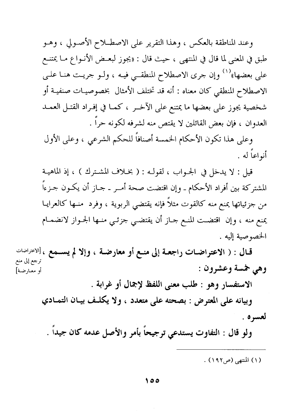 وعند المناطقة بالعكس، وهذا التقرير على الاصطلاح الأصولي، وهو طبق في المعنى لما قال في المنتهى، حيث قال: "يجوز لبعض الأنواع ما يمتنع على بعضها" وإن جرى الاصطلاح المنطقي فيه، ولو جريت هنا على الاصطلاح المنطقي كان معناه: أنه قد تختلف الأمثال بخصوصيات صنفية أو شخصية يجوز على بعضها ما يمتنع على الآخر، كما في إفراد القتل العمد العدوان، فإن بعض القائلين لا يقتص منه لشرفه لكونه حرا.