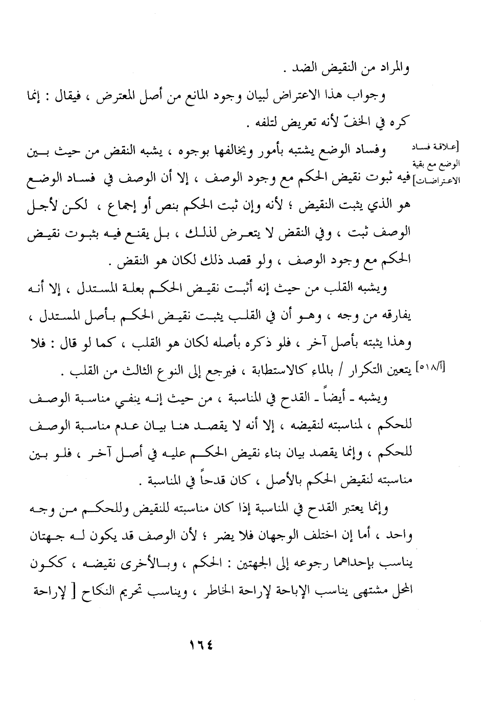 وإنما يعتبر القدح في المناسبة إذا كان مناسبته للنقيض وللحكم من وجه واحد، أما إن اختلف الوجهان فلا يضر؛ لأن الوصف قد يكون له جهتان يناسب بإحداهما رجوعه إلى الجهتين: الحكم، وبالأخرى نقيضه، ككون المحل مشتهى يناسب الإباحة لإراحة الخاطر، ويناسب تحريم النكاح [لإراحة