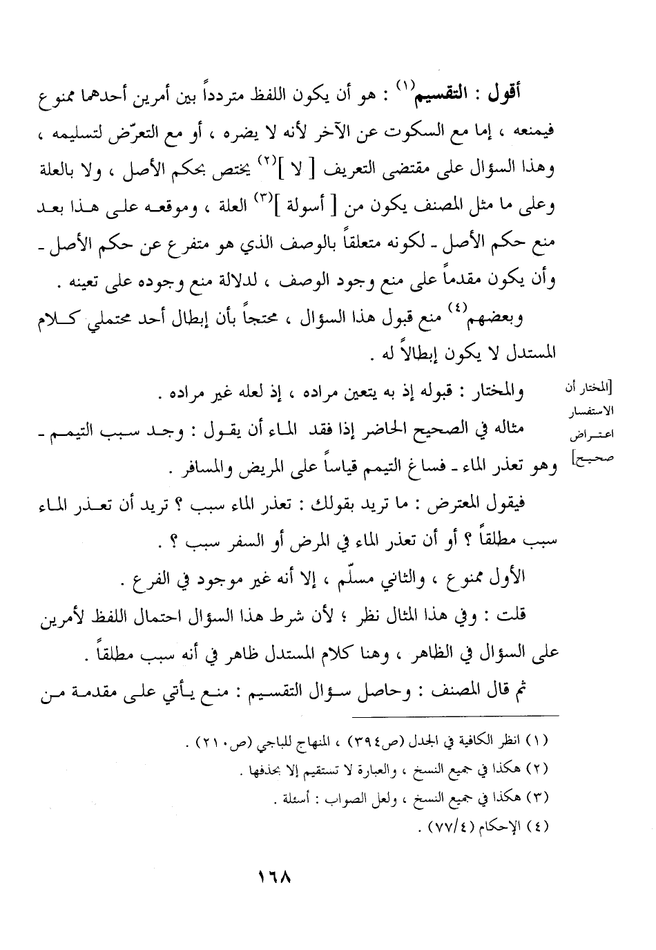 أقول: التقسيم: هو أن يكون اللفظ مترددا بين أمرين أحدهما ممنوع فيمنعه، إما مع السكوت عن الآخر لأنه لا يضره، أو مع التعرض لتسليمه، وهذا السؤال على مقتضى التعريف [لا] يختص بحكم الأصل، ولا بالعلة وعلى ما مثل المصنف يكون من [أسولة] العلة، وموقعه على هذا بعد منه حكم الأصل –لكونه متعلقا بالوصف الذي هو متفرع عن حكم الأصل- وأن يكون مقدما على منع وجود الوصف، لدلالة منع وجوده على تعينه.