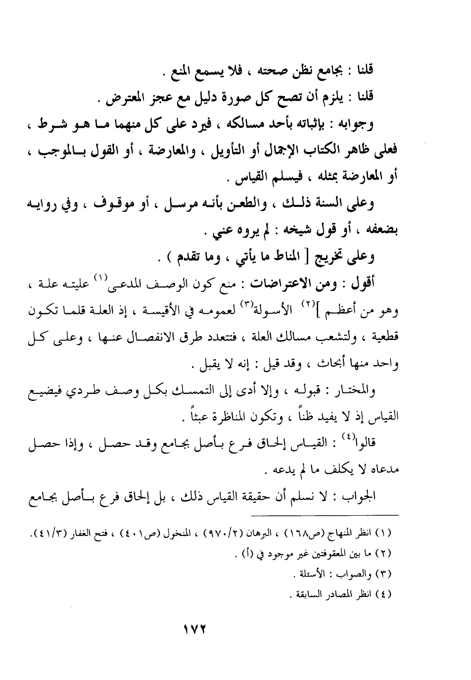 وجوابه: بإثباته بأحد مسالكه، فيرد على كل منهما ما هو شرط، فعلى ظاهر الكتاب الإجمال أو التأويل، والمعارضة، أو القول بالموجب، أو المعارضة بمثله، فيسلم القياس.