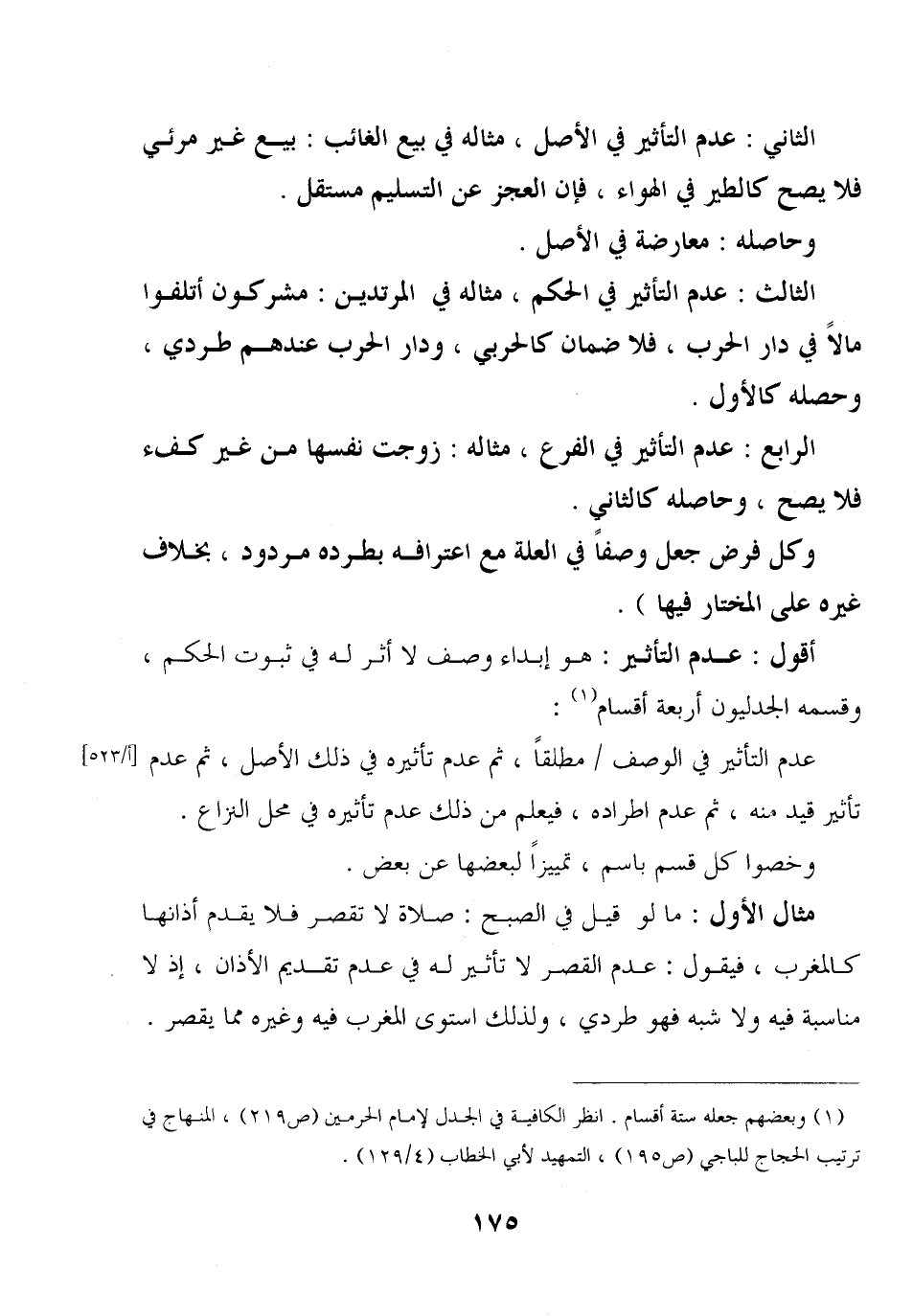 عدم التأثير في الوصف/ مطلقا، ثم عدم تأثيره في ذلك الأصل، ثم عدم تأثير قيد منه، ثم عدم اطراده، فيعلم من ذلك عدم تأثيره في محل النزاع.