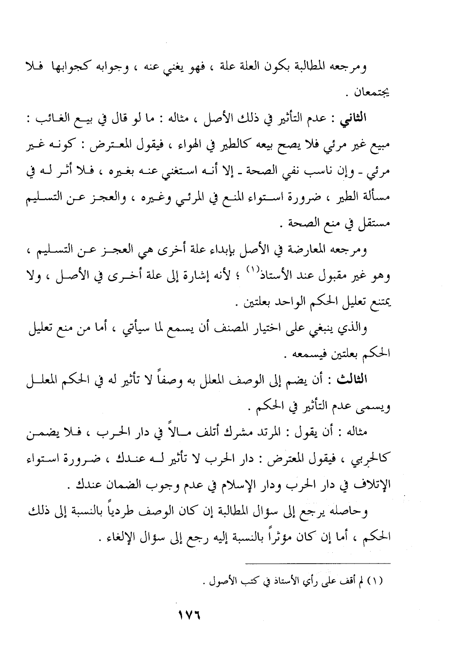 ومرجعه المعارضة في الأصل بإبداء علة أخرى هي العجز عن التسليم، وهو غير مقبول عند الأستاذ؛ لأنه إشارة إلى علة أخرى في الأصل، ولا يمتنع تعليل الحكم الواحد بعلتين.