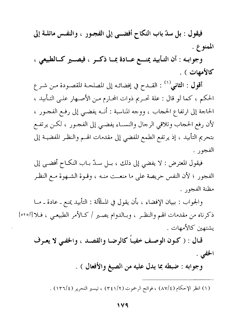 أقول: الثاني: القدح في إفضائه إلى المصلحة المقصودة من شرع الحكم، كما لو قال: علة تحريم ذوات المحارم من الأصهار على التأبيد، الحاجة إلى ارتفاع الحجاب، ووجه المناسبة: أنه يفضي إلى رفع الفجور، لأن رفع الحجاب وتلاقي الرجال والنساء يفضي إلى الفجور، لكن يرتفع بتحريم التأبيد، إذ يرتفع الطمع المفضي إلى مقدمات الهم والنظر المفضية إلى الفجور.