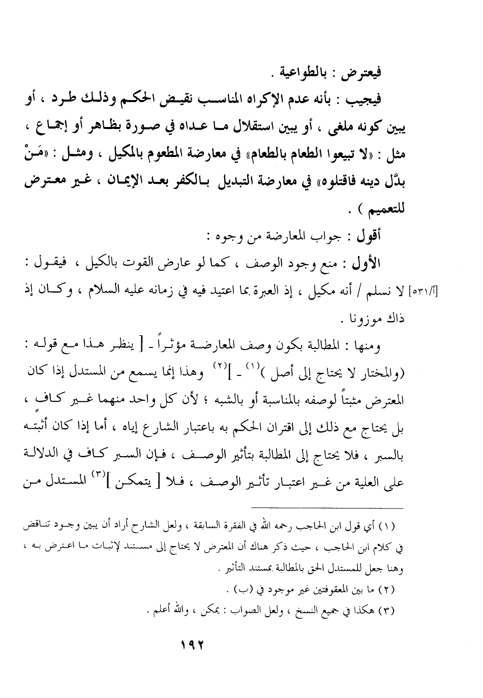 فيجيب: بأنه عدم الإكراه المناسب نقيض الحكم وذلك طرد، أو يبين كونه ملغى، أو يبين استقلال ما عداه في صورة بظاهر أو إجماع، مثل: "لا تبيعوا الطعام بالطعام" في معارضة المطعوم بالمكيل، ومثل: "من بدل دينه فاقتلوه" في معارضة التبديل بالكفر بعد الإيمان، غير معترض للتعميم).