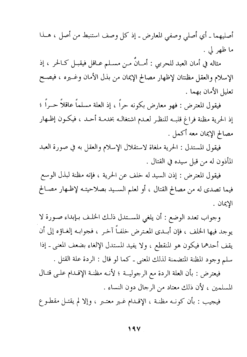 فيقول المعترض: فهو معارض بكونه حرا، إذ العلة مسلما عاقلا حرا؛ إذ الحرية مظنة فراغ قلبه للنظر لعدم اشتغاله بخدمة أحد، فيكون إظهار مصالح الإيمان معه أكمل.
