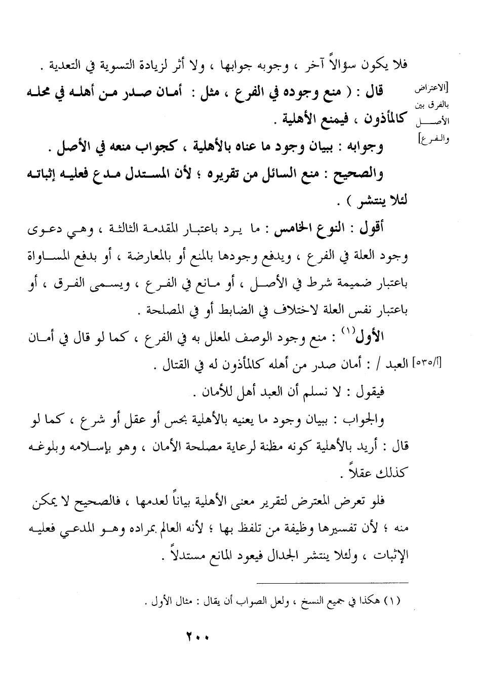 أقول: النوع الخامس: ما يرد باعتبار المقدمة الثالثة، وهي دعوى وجود العلة في الفرع، ويدفع وجودها بالمنع أو بالمعارضة، أو بدفع المساواة باعتبار ضميمة شرط في الأصل، أو مانع في الفرع، ويسمى الفرق، أو باعتبار نفس العلة لاختلاف في الضابط أو في المصلحة.