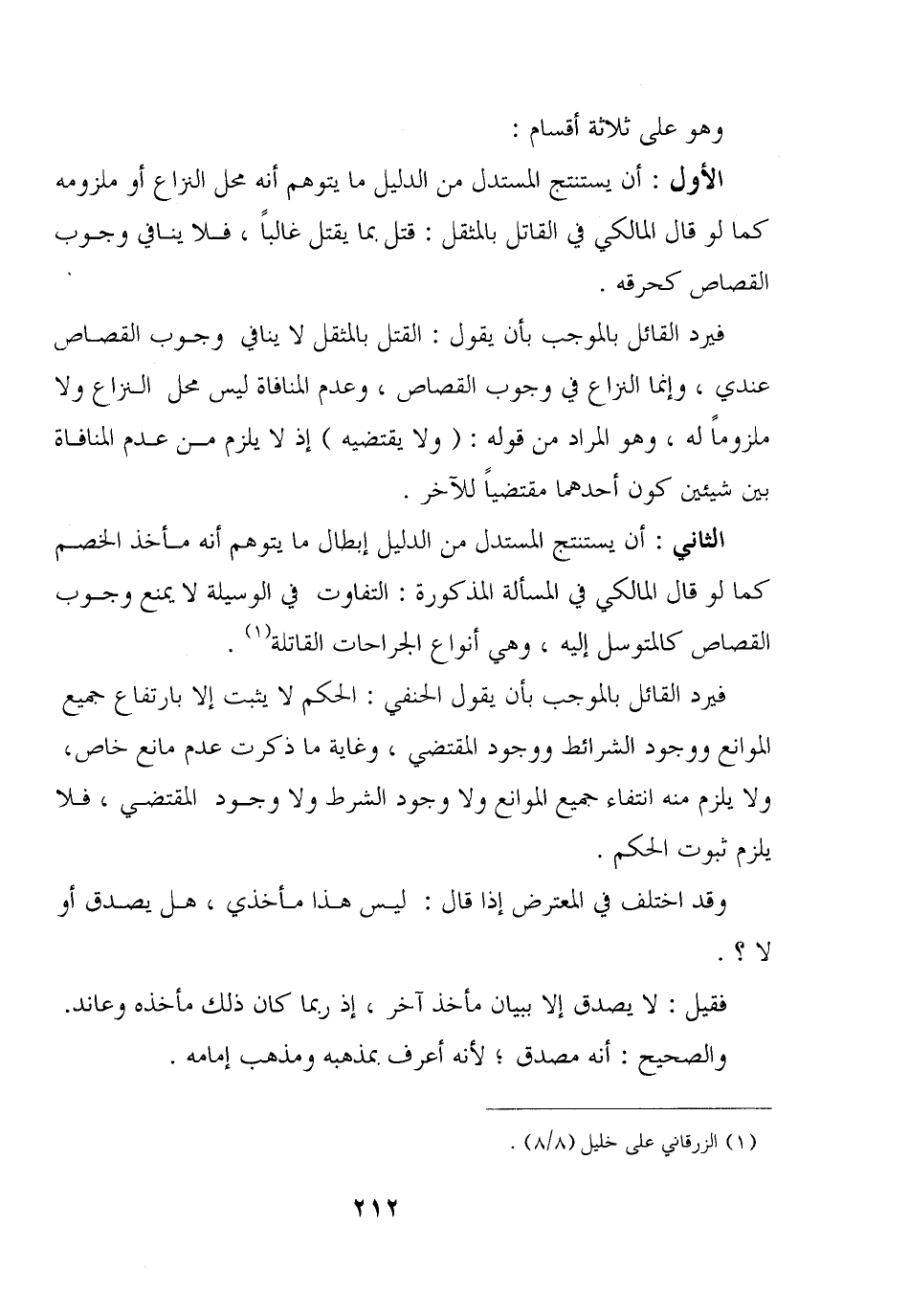 الثاني: أن يستنتج المستدل من الدليل إبطال ما يتوهم أنه مأخذ الخصم كما لو قال المالكي في المسألة المذكورة: التفاوت في الوسيلة لا يمنع وجوب القصاص كالمتوسل إليه، وهي أنواع الجراحات القاتلة.