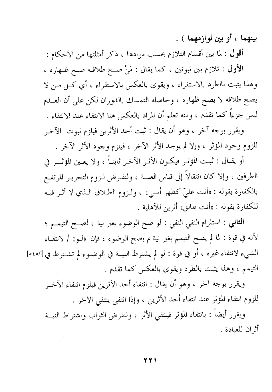 الأول: تلازم بين ثبوتين، كما يقال: ن صح طلاقه صح ظهاره، وهذا يثبت بالطرد بالاستقراء، ويقوى بالعكس بالاستقراء، أي كل من لا يصح طلاقه لا يصح ظهاره، وحاصله التمسك بالدوران لكن على أن العدم ليس جزءا كما تقدم، ومنه تعلم أن المراد بالعكس هنا الانتفاء عند الانتفاء.