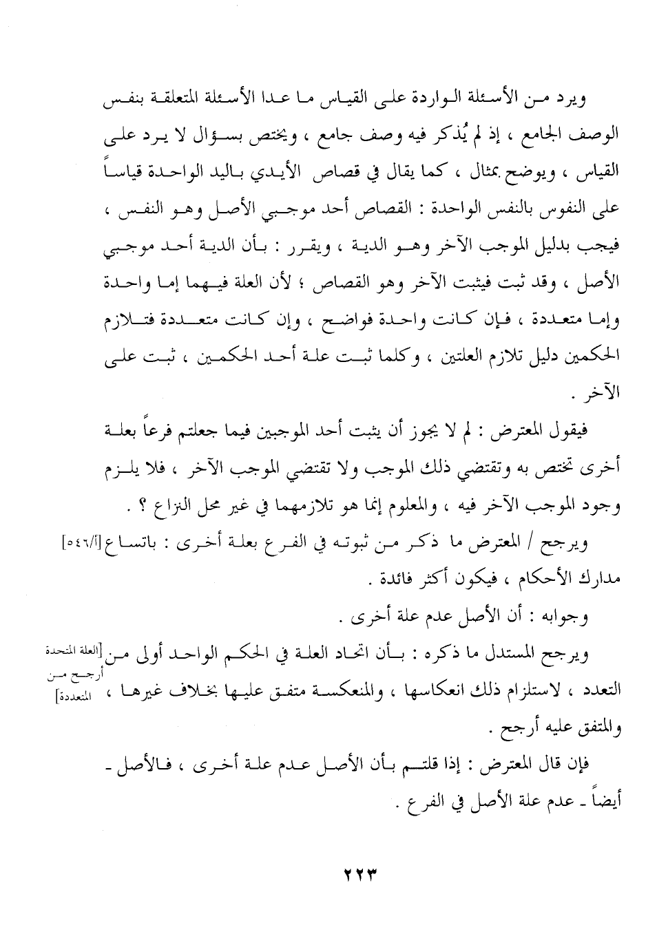 فيقول المعترض: لم لا يجوز أن يثبت أحد الموجبين فيما جعلتم فرعا بعلة أخرى تختص به وتقتضي ذلك الموجب ولا تقتضي الموجب الآخر، فلا يلزم وجود الموجب الآخر فيه، والمعلوم إنما هو تلازمهما في غير محل النزاع؟ .